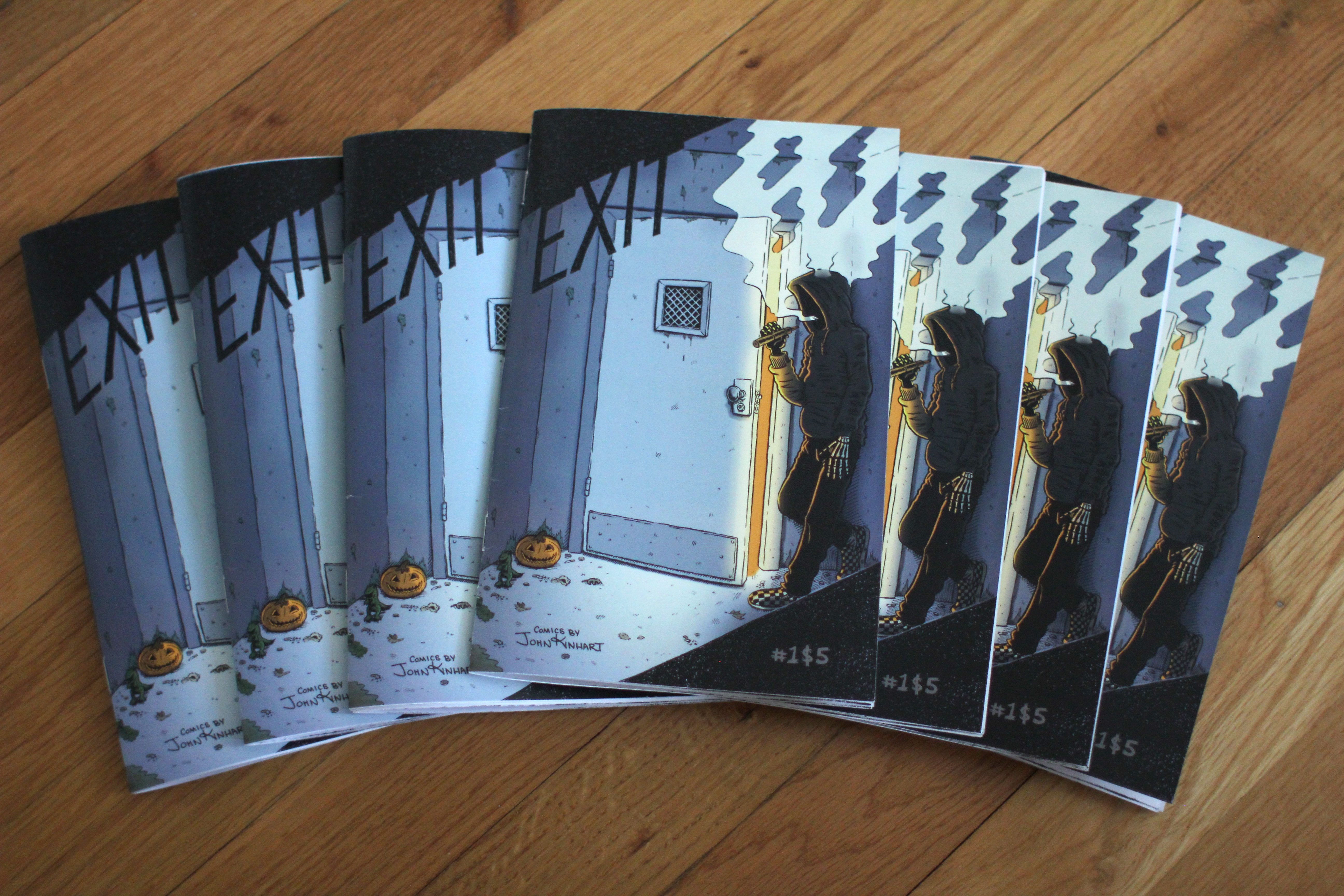 First issue of Exit (my first self-published comic). Includes 7 comics (Cars are Bugs, Robot Dinosaurs from the Future, In The Future, The Slow Crash, Honeymoon, The Earth's Shadow, Unfinished) and several illustrations (32 pages).