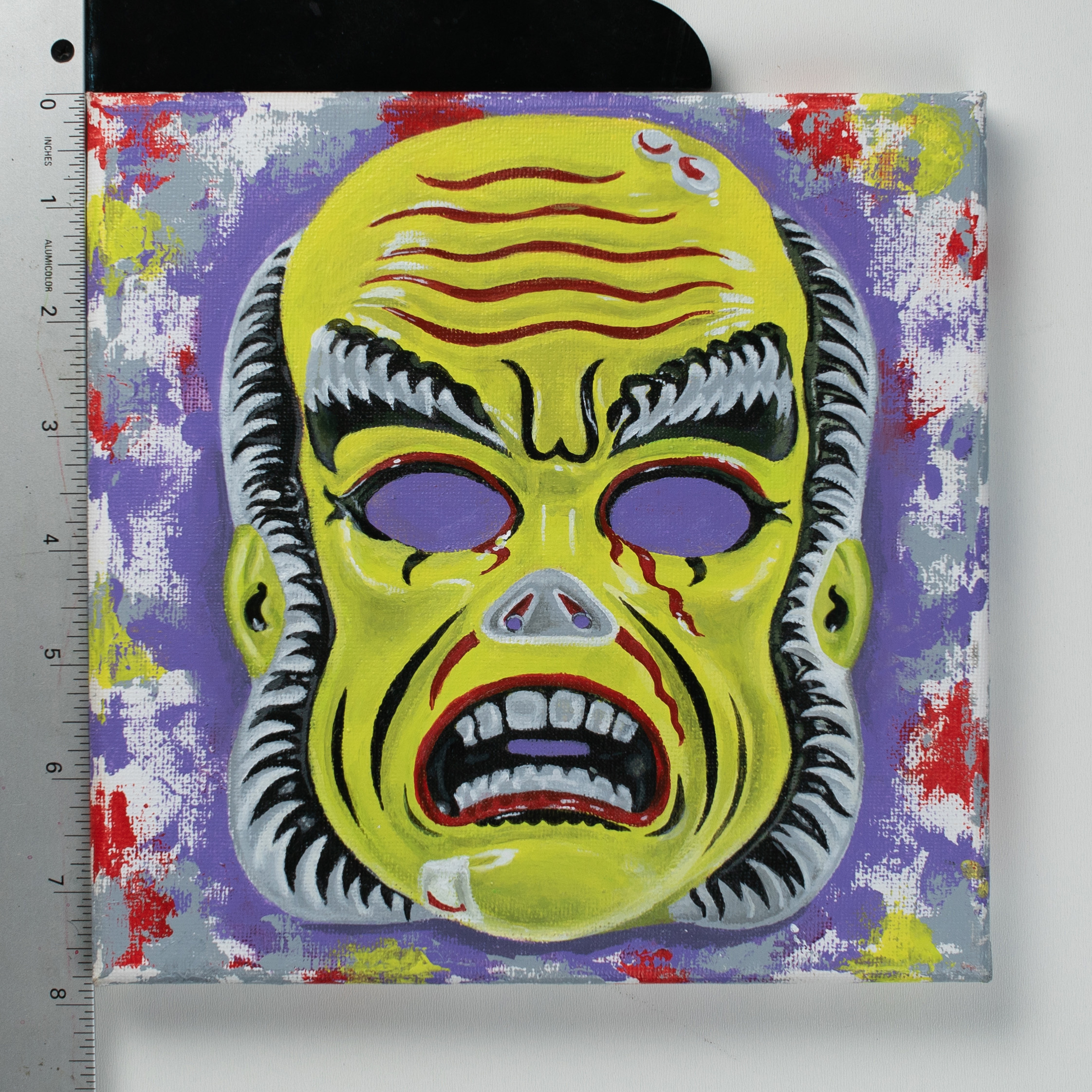 Acrylic painting on canvas of a vintage Halloween, Vacuform, Ben Cooper-style ghoul mask from the 1960s or 1970s. Dimensions: 8" x 8"