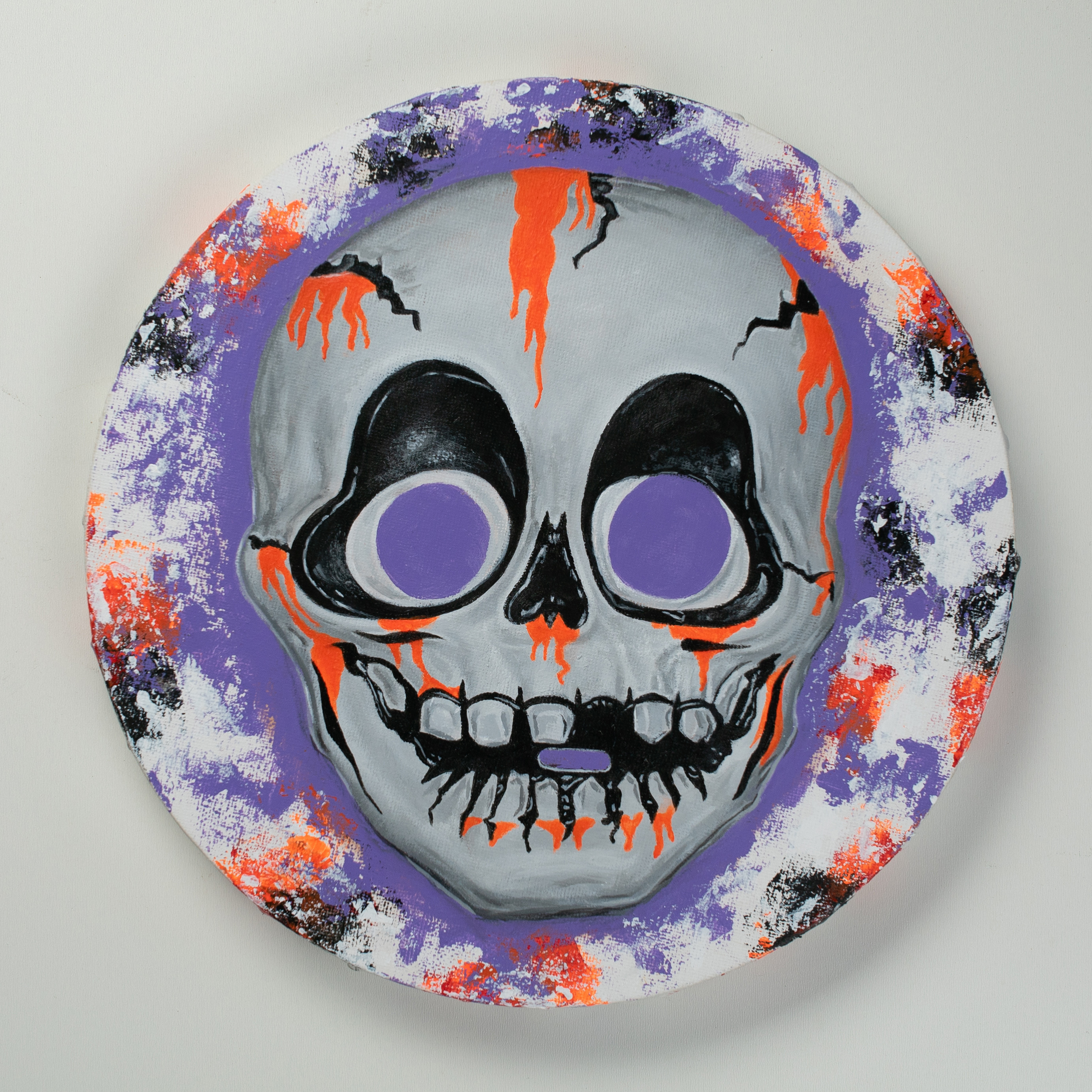 Acrylic painting on canvas of a vintage Halloween, Vacuform, Ben Cooper-style skull mask from the 1960s or 1970s. Neon orange paint. Dimensions: 10" round